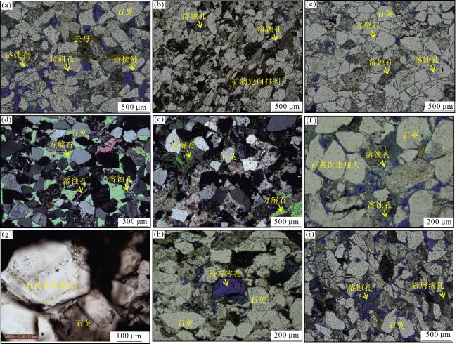 图8 研究区长8段储层成岩作用照片(a)演武地区,M44井, 长8段, 2 647.38 m, 原生粒间孔发育;(b)孟坝地区,Z421井,长8段, 2 352.2 m, 碎屑颗粒定向排列;(c)演武地区,Z434井, 长8段, 2 401.1 m, 碳酸盐胶结作用;(d)演武地区,Z434井, 长8段, 2 401.1 m, 碳酸盐胶结作用; (e)孟坝地区,Z282井, 长8段, 2 315.8 m, 碳酸盐胶结作用;(f)演武地区,Y88井, 长8段, 2 524.74 m, 石英次生加大;(g)演武地区,Y88井, 长8段, 2 524.74 m,石英次生加大;(h)孟坝地区,Z421井,长8段,2 352.2 m,长石溶蚀;(i)演武地区,W1井, 长8段, 2 478.75 m, 岩屑溶蚀孔 Fig.8 Photographs of diagenetic of the Chang 8 Member reservoir in the study area |