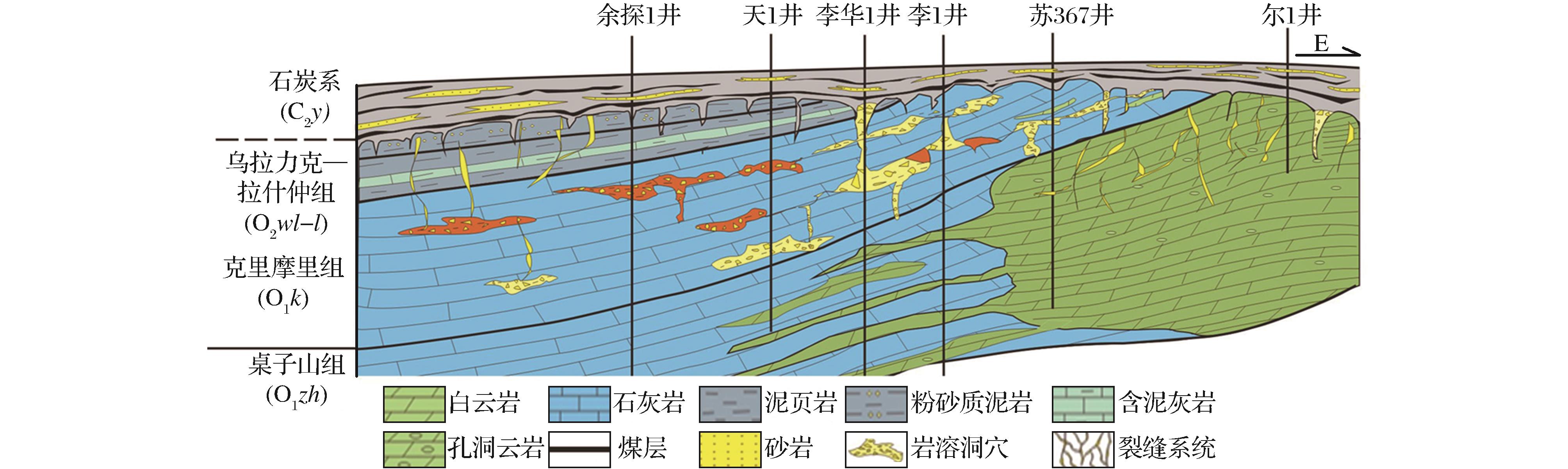 岩溶缝洞型储集体主要发育于克里摩里组的斜坡相颗粒灰岩和藻格架灰岩中。奥陶纪末,盆地西部临近古岩溶台地,古地貌格局为东高西低,岩溶作用强烈,石灰岩由于其易溶性,再叠加构造抬升导致的张裂作用,地表流体通过断裂沟通,进入克里摩里组灰岩发生顺层岩溶作用,大规模地形成呈层状展布的岩溶缝洞体系,如地下暗河 [22-23]。大部分岩溶洞穴体受后期岩溶垮塌和石炭系埋藏等方面的影响,发生塌陷、充填的致密化过程,由于受周围地层的围限保护作用,洞穴内的充填物通常没有经过强烈的压实作用,成岩作用相对较弱,因此,岩溶洞穴体具有较好的储集性能。 岩溶缝洞型储层的储集空间以塌陷未充填洞穴、洞穴垮塌充填角砾间孔和裂缝为主。塌陷未充填洞穴在钻探及测井过程中都有明显的特征,在钻井、录井中,往往会出现钻时加快、钻具放空和漏失泥浆等现象。在测井曲线上,呈低自然伽玛、高声波时差、低电阻率、低密度及井径扩径严重等特征,如天1井在克里摩里组钻遇塌陷未充填洞穴层6.0m,漏失