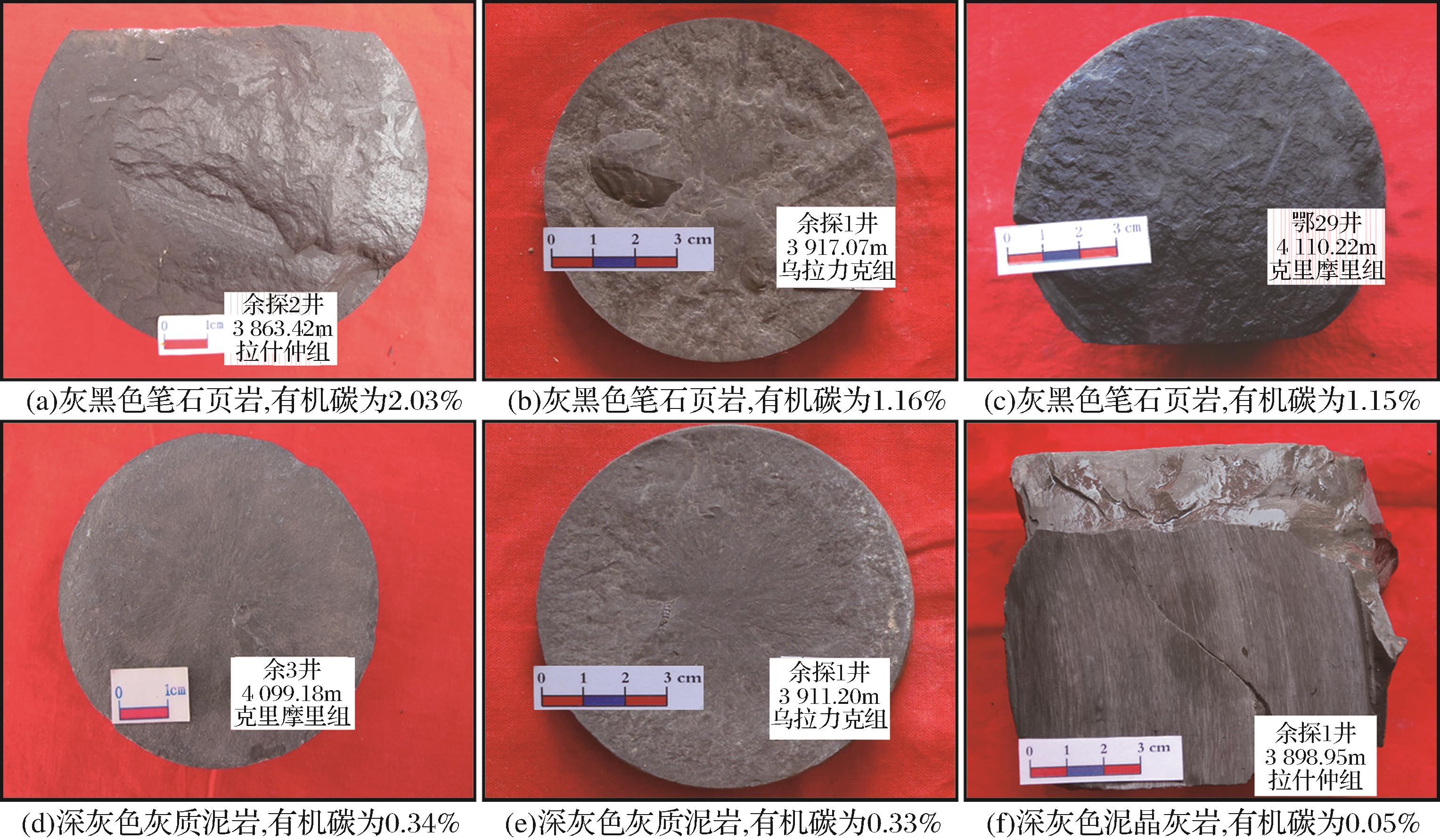 有机碳含量(TOC)、氯仿沥青“A”、总烃(HC)及生烃潜力(S1+S2)是烃源岩评价的4项重要指标,其中有机碳含量最为重要,因此,有机质丰度是烃源岩评价的最主要手段。盆地西部有机质含量总体较高,多在0.3%以上,局部层段可达1%~2%(表2),如余探1井有机碳(TOC)含量平均为0.54%,最高为1.86%。 泥质物对有机质的吸附和保存起重要作用,泥质含量与碳酸盐岩有机碳含量呈正相关性,泥质含量越高,颜色越暗,有机质丰度相对富集(图4)。研究区内乌拉力克组的泥质含量整体比拉什仲组要高,其有机碳含量亦整体比拉什仲组要高,如惠探1井乌拉力克组的有机碳含量为0.60%,拉什仲组有机碳含量为0.23%。从岩性上看,研究区内奥陶系烃源岩中的灰黑色含笔石泥岩有机碳含量较高,普遍大于0.5%,含灰泥岩、泥质灰岩稍差为0.2%~0.5% (图5),而乌拉力克组底部深水斜坡—盆地相带中