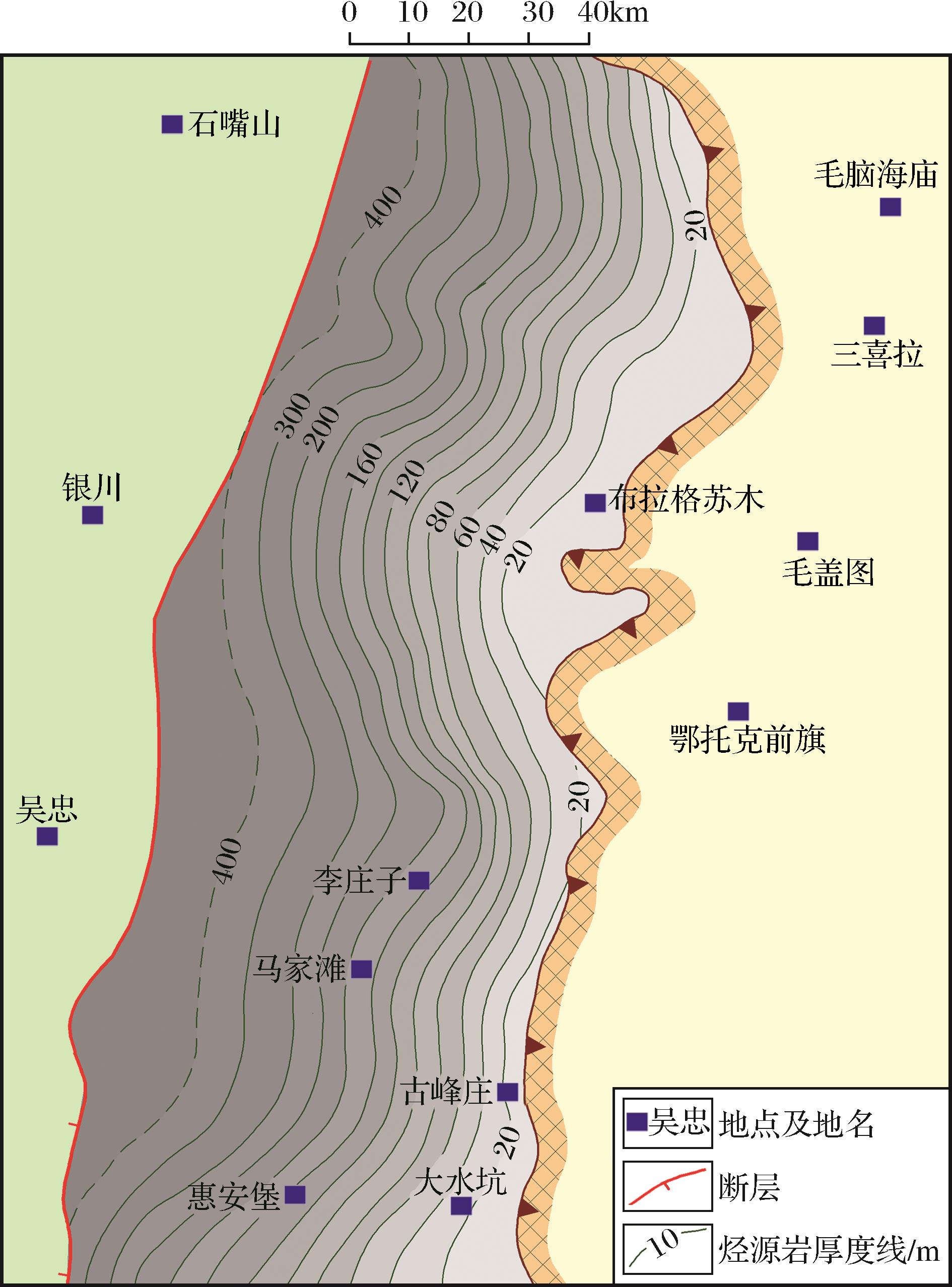 图6 鄂尔多斯盆地西部中上奥陶统烃源岩等厚线