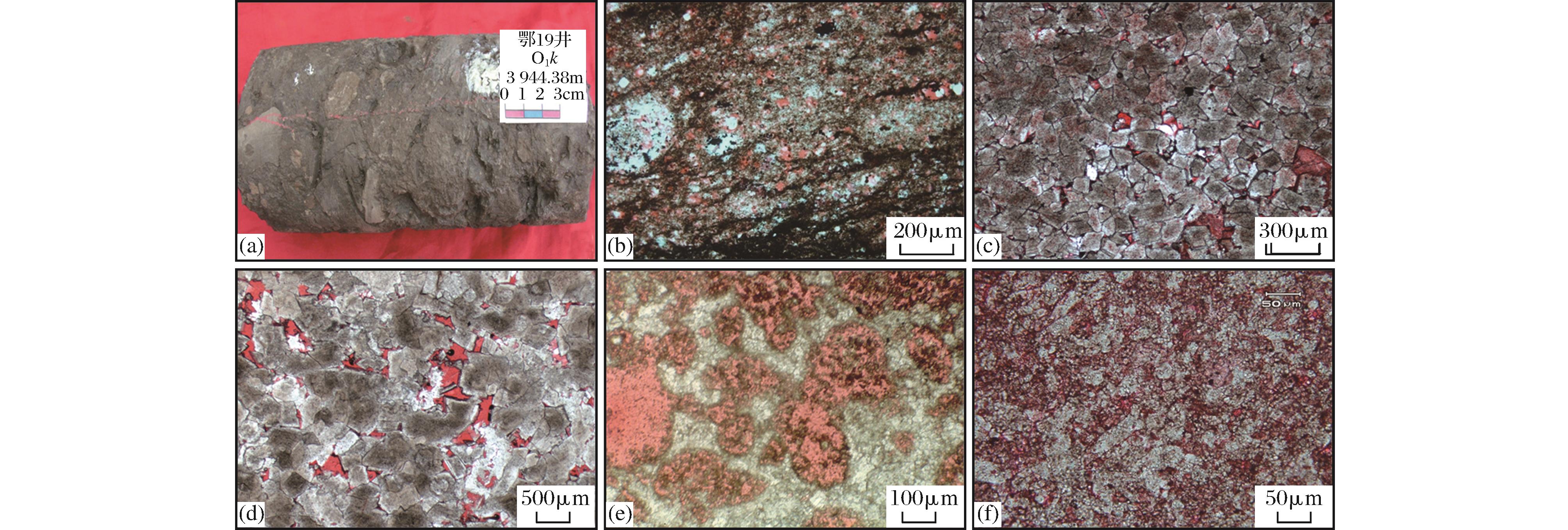 白云岩型储集体主要发育于克里摩里组、桌子山组的粉晶—细晶白云岩中。在鄂托克旗—鄂托克前旗—定边一带,由于靠近古隆起,受大气淡水的影响较为强烈,极有利于混合白云岩化作用的进行[24],形成的白云岩体呈块状,厚度巨大可达200~450m,如定探1井桌子山组白云岩厚431m,沿中央古隆起呈SN向连片分布。向西白云岩厚度变薄,如在铁克苏庙—李庄子—惠安堡一带,白云岩体厚度约30~80m,呈薄层状夹于灰岩中,连片性较差,局部呈透镜状分布,是由于短期海退,在局部洼陷区,造成水流不畅,含盐度增加,发生渗透回流白云岩化,粉晶白云岩的δ13C值平均为0.55‰,δ18O值平均为-7.16‰。 该类储集体的储集空间类型主要为白云石晶间(溶)孔,次为微裂缝。储层岩石中的白云岩主要以粗粉晶—细晶结构为主,白云石晶体的自形程度较高,往往呈半自形—自形状,晶间孔的几何形态多为由晶粒支架构成的多面体或三角形,孔壁光滑、平直,孔径大小为10~40μm[图9(c)];白云石晶体在淡水溶蚀或碳酸盐等易溶矿物选择性溶解作用下,被溶蚀成港湾状,形成晶间溶孔,孔隙通常为不规则状的形态,孔径大小为30~200μm[图9(d)]。白云岩储层的孔隙度为3%~7%,渗透率为(0.125~0.462)×10-3μm2,储集性能良好。