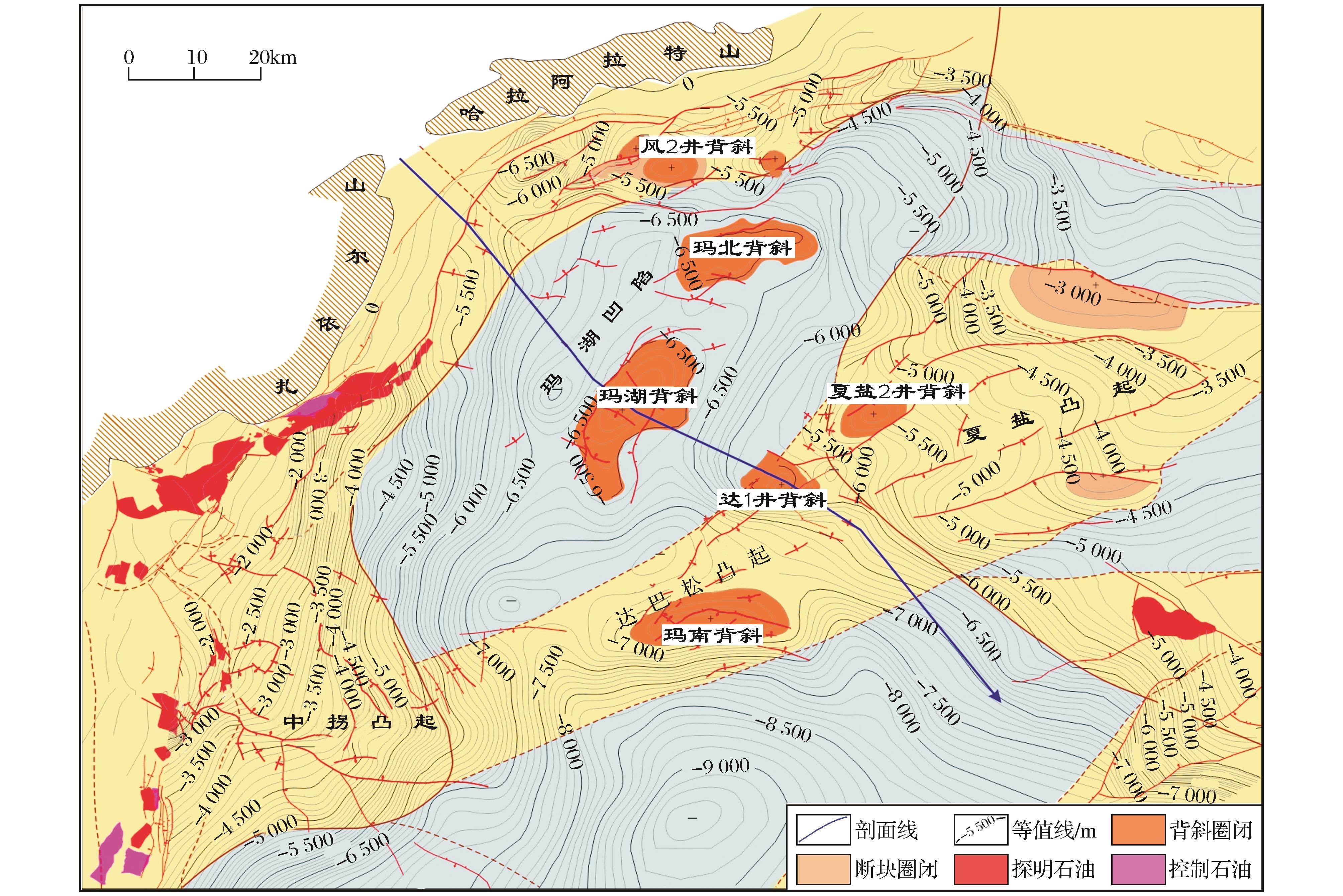 木河组、风城组有零星的火山喷发活动,风城组局部地区发育云质岩。石炭系、佳木河组、风城组之间都发育角度不整合,普遍经历了10Ma以上的风化作用,从准噶尔盆地石炭系火山岩、塔里木盆地奥陶系、四川盆地震旦系、鄂尔多斯盆地下古生界碳酸盐岩的勘探经验表明,在风化淋滤和断裂的作用下,火山岩、云质岩等特殊储层在6 000m以深仍可存在较高的孔隙度和渗透率。 围绕玛湖凹陷落实了一批构造,包括背斜圈闭和断块、断鼻及断层—地层圈闭,圈闭埋深在5 800~6 800m之间,主要围绕2个构造带发育,分别为乌尔禾—玛湖构造带和中拐—达巴松—夏盐构造带。夏子街—玛湖构造带包括风2井背斜、玛北背斜、玛湖背斜,中拐—达巴松—夏盐构造带包括夏盐2井背斜、达1井背斜和玛南背斜(图1)。这些深层的构造圈闭从石炭系开始继承性发育,背斜、断背斜隆起幅度高,形态清楚,尤其在主成藏期,构造幅度明显高于周边的凹陷(图2)。图2 达1井背斜、玛湖背斜主成藏期侏罗系沉积前地震剖面(剖面位置见图1)