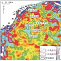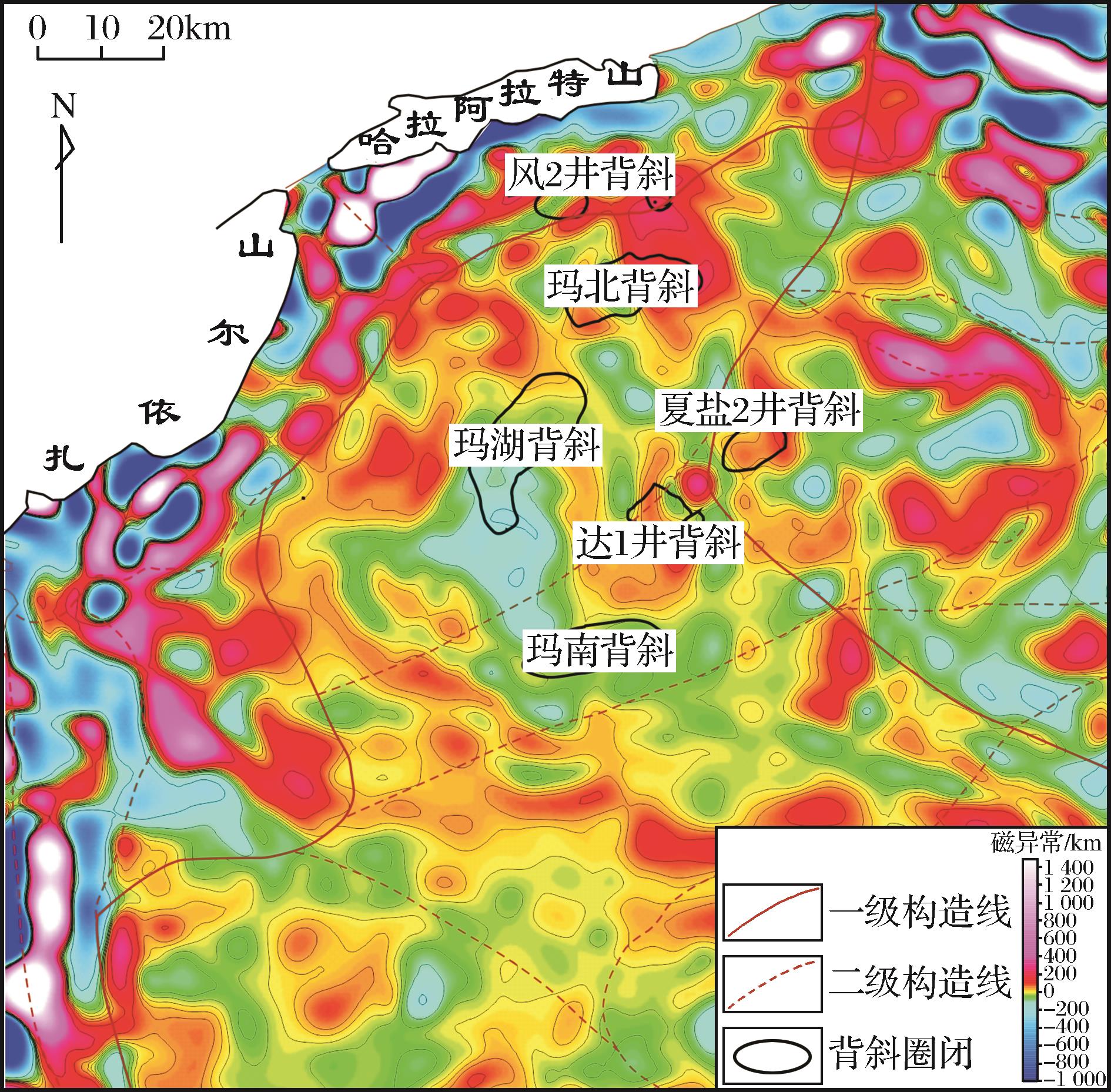 火山岩、碎屑岩在地球磁场磁化作用下产生的磁异常不同,火山岩较强磁性、较高电性和较大密度等地球物理特性,因此可以根据磁力异常来区分石炭系(包括二叠系佳木河组)火山岩和碎屑岩[11-14]。根据玛湖地区1∶50万航磁资料向下延拓、求取剩余异常等高分辨率处理结果,可以发现玛北背斜、达1井背斜、夏盐2井背斜处于红色、黄色的中—强磁异常区,玛湖背斜、玛南背斜绝大部分处于绿色、浅蓝色的弱磁异常区(图3)。对比石西油田、陆东地 区已钻遇的火山岩,通过已钻井的岩石物性(密度、 磁性、电阻率)标定,认为中—强磁异常是中基性火 山岩的响应特征,中—弱磁异常是中酸性火山岩的