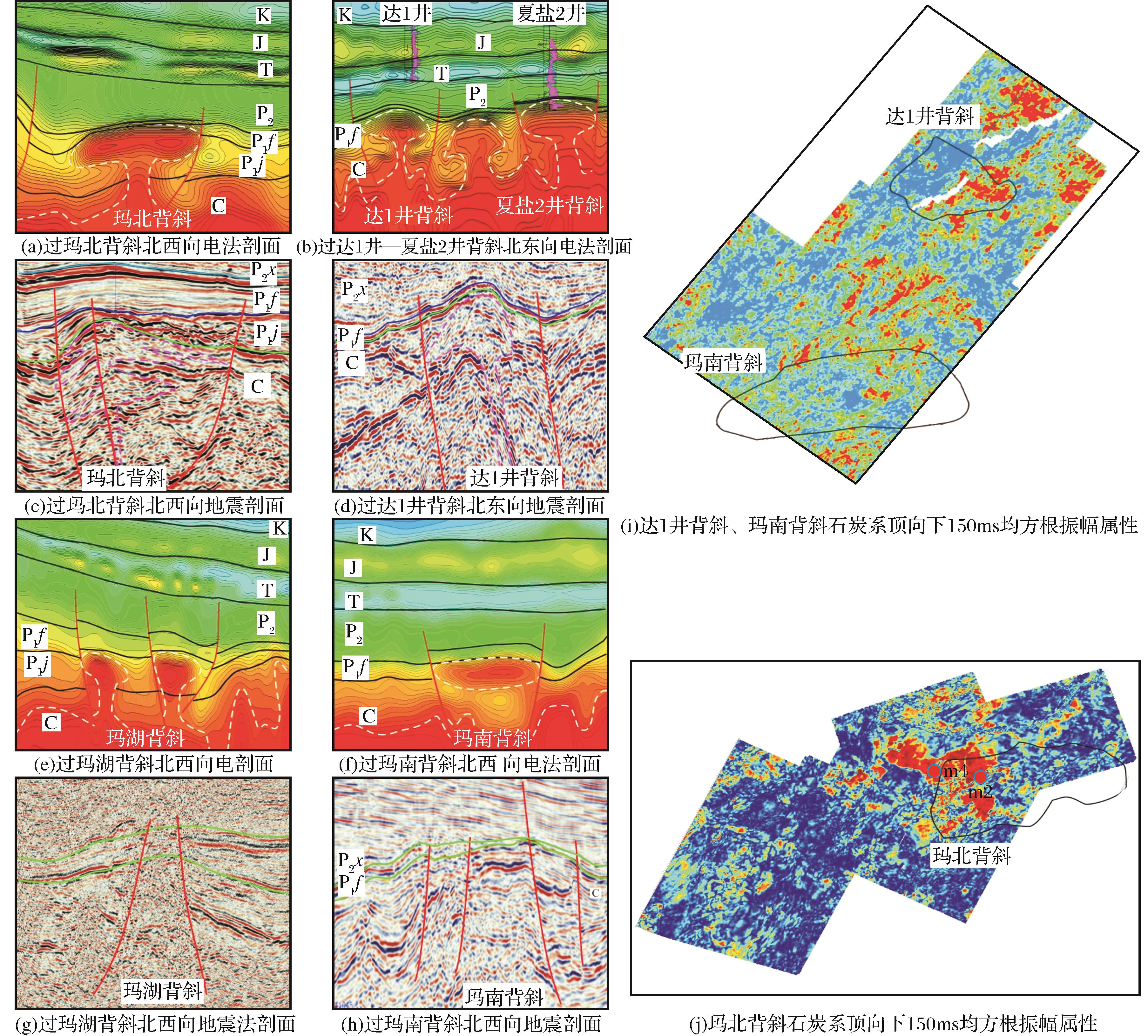 图4 玛湖地区4个主要构造电法剖面、地震剖面及平面属性