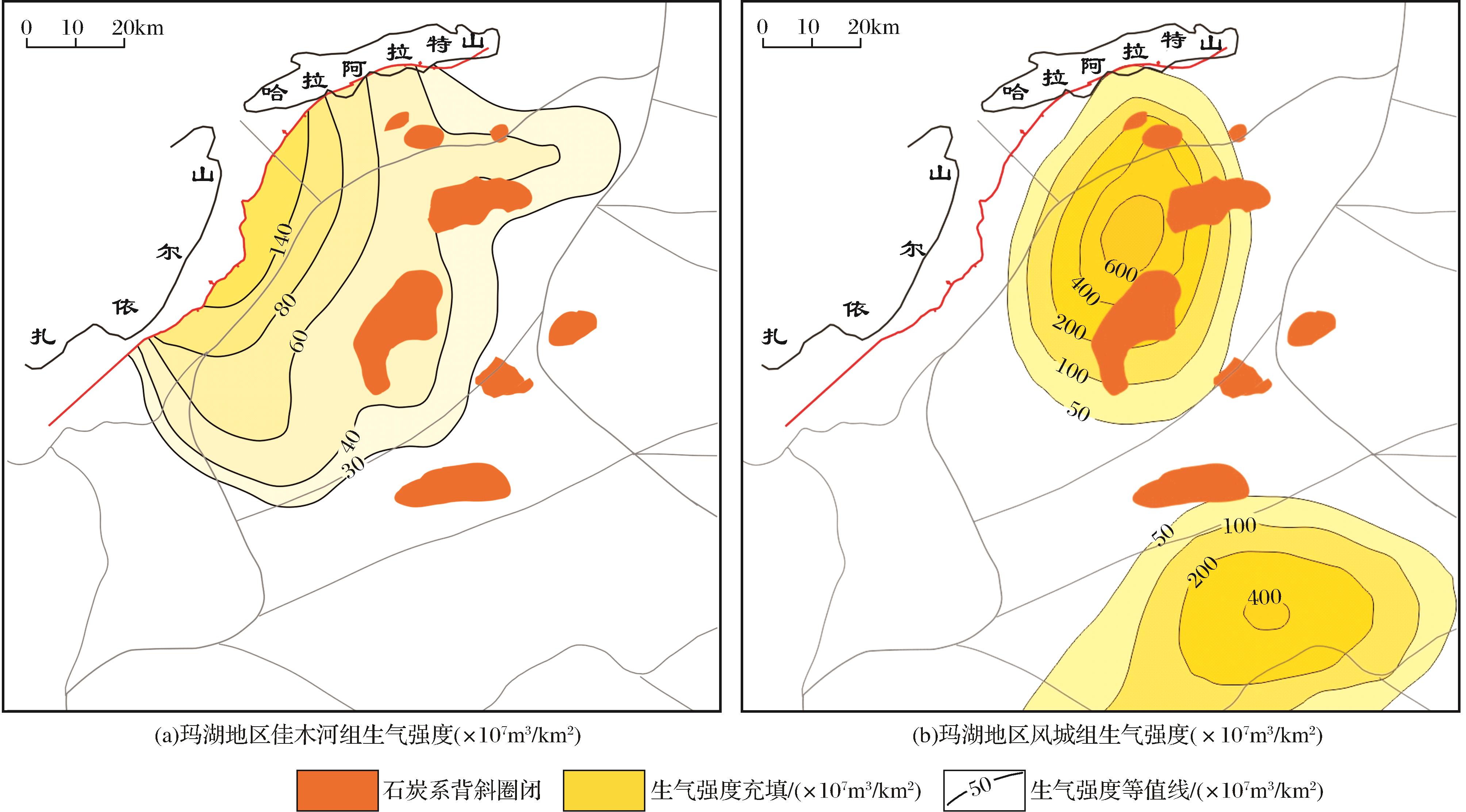 图6 玛湖地区佳木河组、风城组生气强度(×107m3/km2)