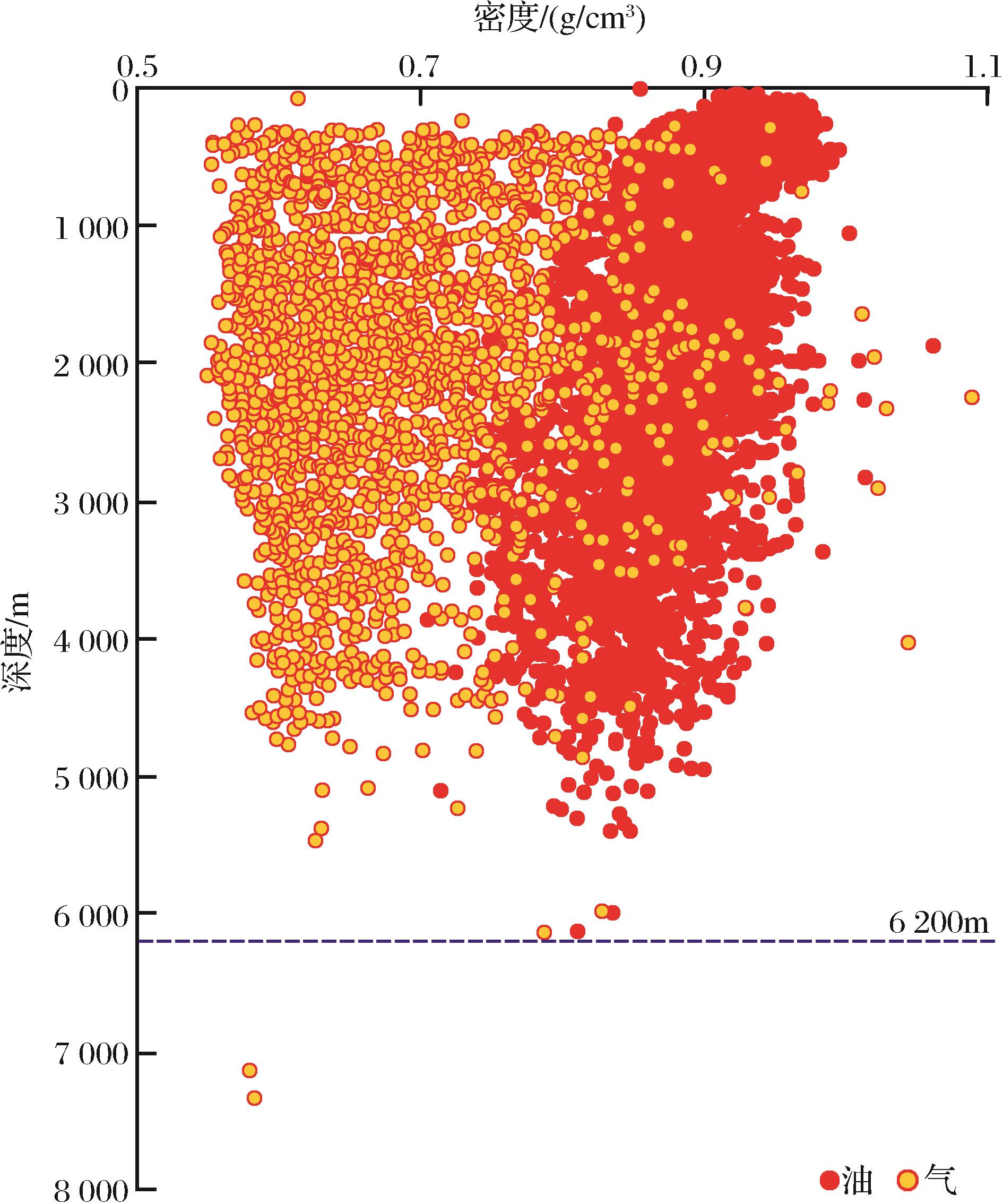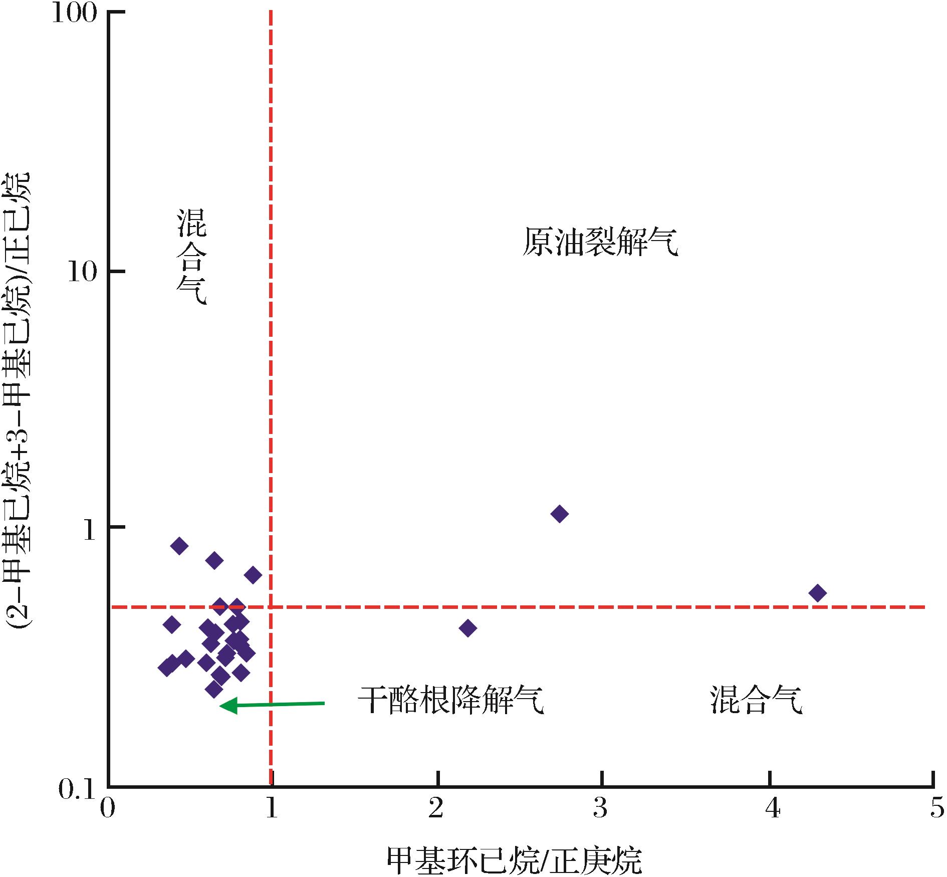 风城组烃源岩演化阶段及已知天然气特征均证明玛湖地区除了存在正常的干酪根初次裂解气之外,还存在原油裂解气。根据模拟实验结果,原油裂解气发生的温度为160℃[22,23],如果地温梯度已知,那么原油裂解气发生的深度界限可以利用地表温度及地温梯度进行估算。根据第三次全国油气资源评价结果,准噶尔盆地西北缘现今的地温梯度为2.3℃/100m,平均地表温度为15℃,据此计算玛湖地区原油裂解的深度界限大约为6 300m,理论上6 300m以深的地层中烃类流体以气相为主。 统计准噶尔盆地已发现油、气密度与深度之间的关系,发现原油的密度随深度增加有变小的趋势,并且,目前在6 200m以深还没有发现石油(图7),似乎验证了玛湖地区原油裂解气深度界限为6 300m的推测。当然,深部钻井较少,该推测还有待今后深层勘探进一步加以证实。 前人[24-26]通过对干酪根和原油实验热模拟生成的轻烃以及典型干酪根和原油裂解气中轻烃组成对比研究认为干酪根裂解气和原油裂解气在轻烃组成上存在差别。原油二次裂解生成的天然气中异构烷烃和环烷烃含量较高,而干酪根裂解气该值较低。主要表现在甲基环己烷/正庚烷和(2-甲基己烷+3-甲基己烷)/正己烷2项指标上。一般情况下原油裂解气这2项指标均较高,甲基环己烷/正庚烷大于1.0,(2-甲基己烷+3-甲基己烷)/正己烷大于0.5。而干酪根裂解气这2项比值均较低。根据这一指标来分析玛湖地区二叠系已发现的天然气,发现玛湖凹陷区大部分天然气样品落在干酪根裂解区,同时也有少量的原油裂解气和混合气的存在(图8),说 明玛湖地区与风城组烃源岩有关的天然气有2种成 因类型:一种来源于干酪根初次裂解气;另一类来源于原油裂解气,这一点与风城组烃源岩所处的演化阶段及生烃类型相吻合。