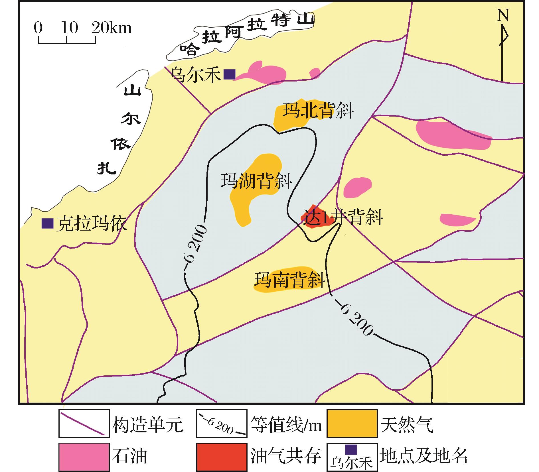根据玛湖地区风城组烃源岩演化阶段及原油裂解深度界限6 200m的推测对玛北背斜、玛湖背斜、达1井背斜及玛南背斜的流体相态进行评价预测,玛北背斜、玛湖背斜位于风城组烃源岩的生烃中心,早期生油窗阶段形成油藏,白垩纪以来风城组烃源岩进入干酪根生气高峰阶段,早期的油藏被天然气置换形成气藏,玛北背斜、玛湖背斜现今的流体相态应该是干酪根裂解气藏。达1井背斜位于风城组烃源岩生烃中心边缘,早期生油窗阶段形成油藏,生气高峰期可能充注部分天然气形成油气藏。达1井背斜石炭系高点埋深5 900m,佳木河组高点埋深5 800m、风城组高点埋深5 620m,各圈层埋深均小于原油裂解深度6 200m,原油没有发生裂解,达1井背斜的流体相态应该是油气共存。玛南背斜风城组高点埋深6 600m,佳木河组高点埋深6 700m,石炭系高点埋深7 025m,各圈层埋深均大于原油裂解深度6 200m,生油窗阶段形成的油藏发生原油裂解形成天然气藏,因此,玛南背斜应该是原油裂解气藏(图9)。图9 玛湖深层构造流体相态预测