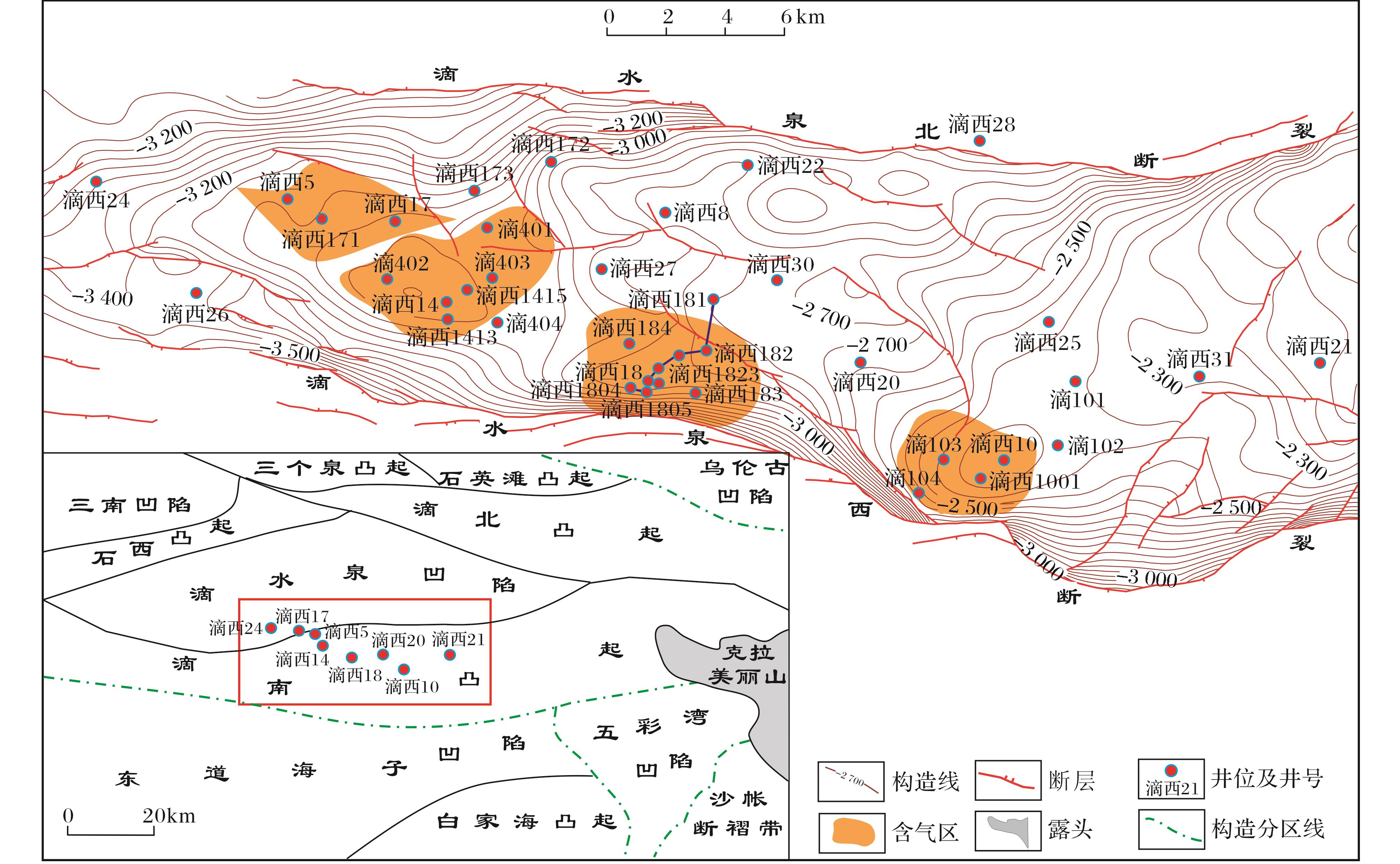 石炭纪是准噶尔—吐哈地块由地块裂离、拼合到克拉通内坳陷盆地演化的过渡时期,在早、晚石炭世分别经历了由伸展到聚敛的发展旋回,早石炭世以海相沉积为主,晚石炭世发育海陆交互相与火山岩建造[4]。油气成藏主要受石炭系滴水泉组和二叠系平地泉组2套烃源岩控制,在石炭系火山岩储层中形成自生自储型和上生下储型油气藏,盖层为二叠系和三叠系泥岩[11,12]。 火山喷发活动发生于早石炭世(321~369Ma)与板块俯冲作用相关的活动大陆边缘岛弧挤压构造环境[13]。巴山组自下而上发育下部(C2b1)、中部(C2b2)以及上部(C2b3)3个喷发沉积旋回,每个旋回火山能量由强变弱,形成下部火山岩、上部沉积岩的多套组合。火山岩岩相分区性明显,整体呈现西北部以中—基性溢流相为主,中部以爆发相和火山沉积相为主,东南部以中—酸性溢流相为主。其中,滴西18井区为厚层块状中—酸性浅成侵入岩与沉火山岩交互型建造的火山机构[7],火山口位于滴西8井附近,次火山通道依托滴水泉西断裂[5]。次火山岩主要发育于火山喷发沉积旋回的中、上部,火山岩体顶面整体表现为以滴西18井为中心的似背斜构造,向两侧构造降低,南边为断层所封挡,向其他方向逐渐尖灭(图2)[5]。 由于该套侵入岩侵入深度普遍小于1.5km,且与火山作用具有密切联系,因此本文将其归为次火山岩相。受石炭纪末整体抬升背景控制,火山岩遭受剥蚀,储集层主要位于石炭系顶部不整合面附近,受风化淋滤改造比较明显[12]。