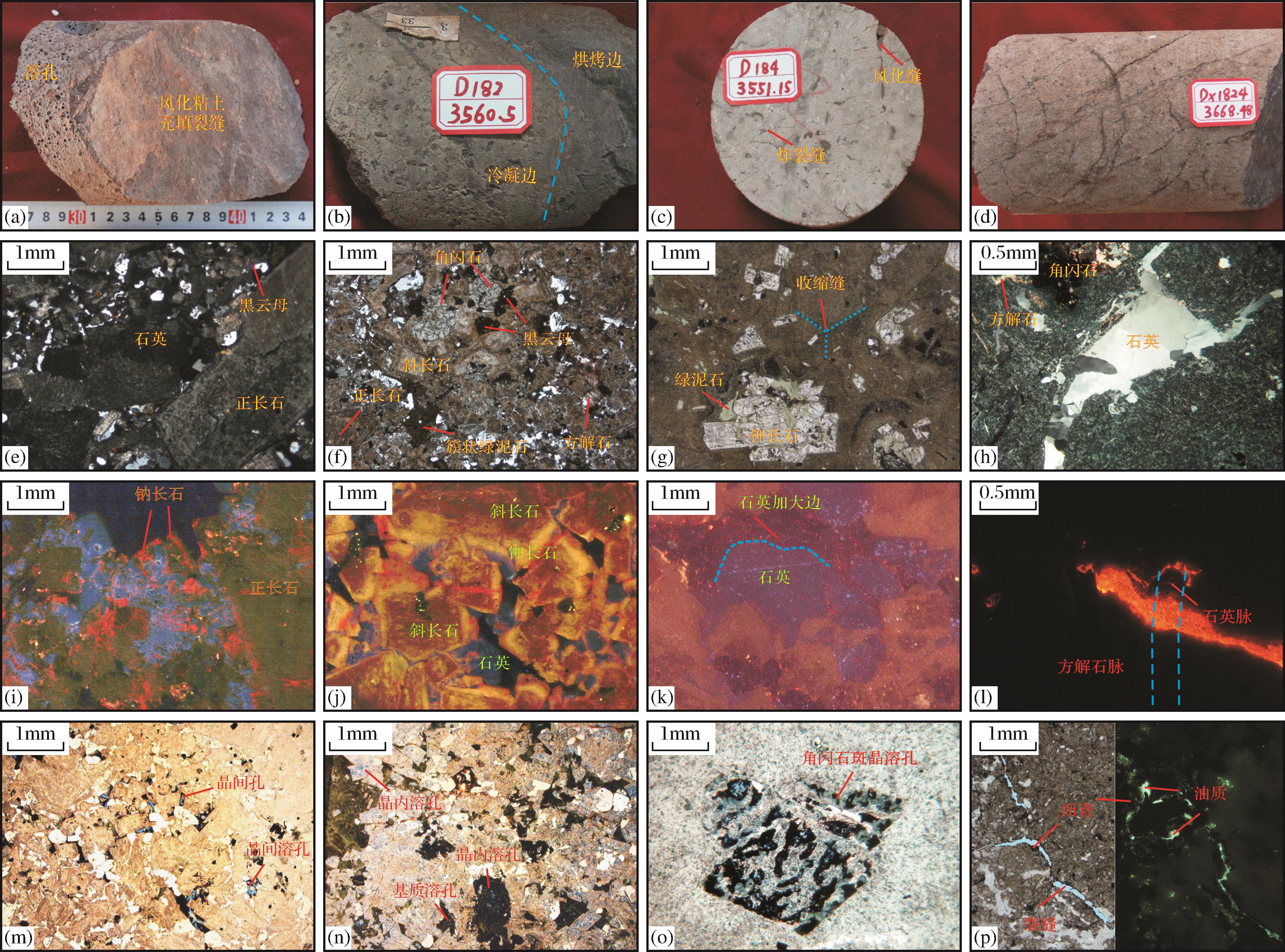 通过铸体薄片观察,结合扫描电镜、阴极发光分析等,研究区次火山岩储集空间类型以斑晶晶内溶孔、晶间溶孔、基质溶孔以及构造缝等次生孔隙为主,产层段主要以各类次生溶蚀孔隙的组合形式出现,且由裂缝沟通成为有效储层[图3(m)—图3(p)]。 滴西18井区次火山岩孔隙度在1.7%~12.8%之间,平均为7.7%,主要分布在6%~10%范围内;渗透率主要分布在(0.01~1.0)×10-3μm2之间,最高可达200×10-3μm2以上,孔隙度、渗透率相关性较差,裂缝对渗透性的贡献性大。裂缝的存在提供了流体流动的额外通道,大大增强了油气的渗流能力,同时也为油气储存提供了附加的储集空间[15]。