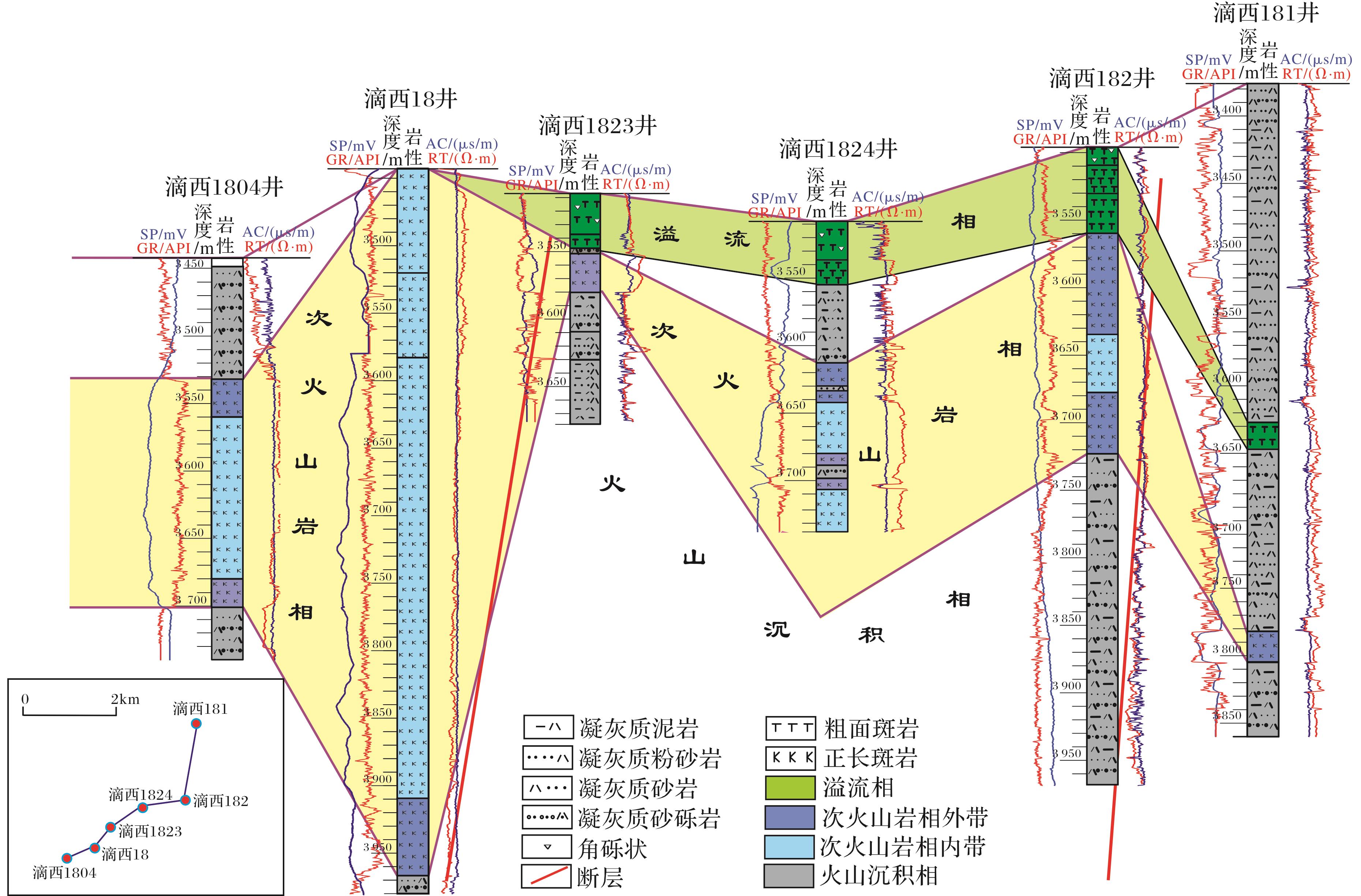 图5 滴西1804井—滴西18井—滴西1823井—滴西1824井—滴西182井—滴西181井连井火山岩相对比