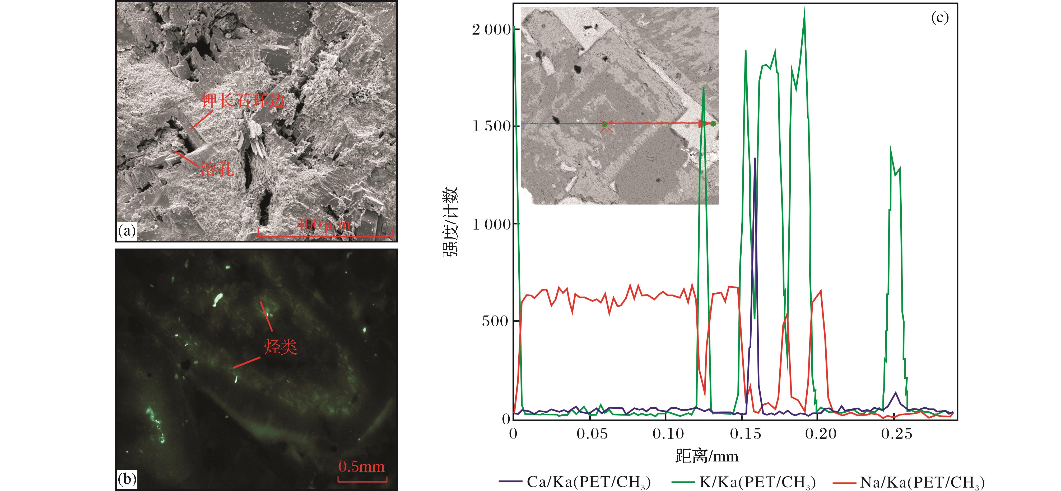 当岩层处于深埋阶段时,有机质脱羧产生的大量有机酸溶液和由矿物间的相互作用产生的无机酸溶液,通过孔隙、裂缝等和火山岩体相沟通,改变了流体介质的性质,促使长石等不稳定硅酸盐矿物的溶解[29]。酸性水溶蚀作用在研究区次火山岩储层中非常常见,主要为斜长石斑晶及基质长石的溶蚀以及部分辉石、角闪石、黑云母等镁铁矿物的溶蚀[图3(m)—图3(p)]。 在酸性介质中,斜长石会发生选择性溶蚀,优先溶蚀富钙的斜长石,其次是富钠的,最后才会溶蚀富钾的碱性长石[30][图6(a)],在荧光照射下,斜长石 的发光明显呈现出环带状[图6(b)],电子探针线扫描结果显示,显示荧光的长石主要为钠长石,而钾长石荧光显示不明显[图6(c)],与前人研究结果一致。溶蚀作用形成大量次生溶蚀孔隙,对次火山岩储层的形成起到积极作用。
