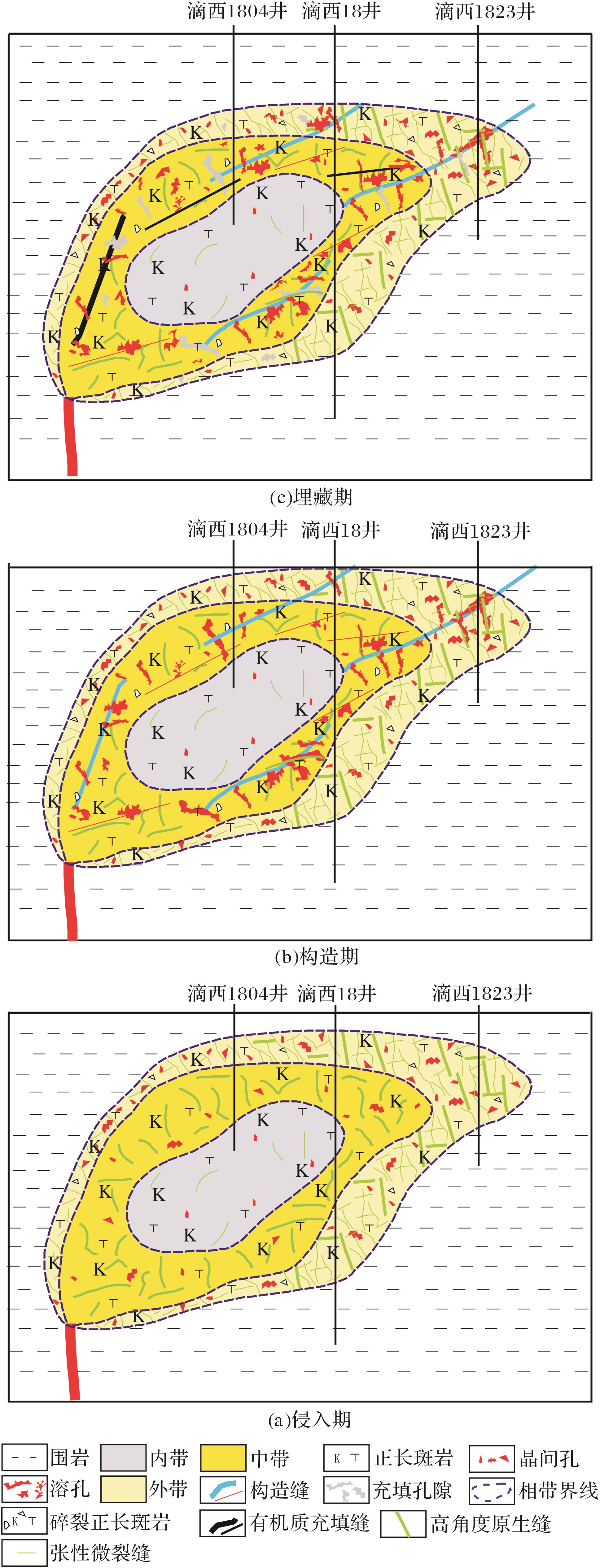 根据上述研究成果,认为次火山岩储层形成及演化可划分为3个阶段:侵入期—原生储集空间形成阶段、构造期—次生储集空间形成阶段及埋藏期—封闭体系储集空间重新分配阶段。 侵入期—原生储集空间形成阶段[图7(a)]:岩浆侵入围岩时期是原生储集空间形成的主要时期,火山岩岩相分布决定了原生储集空间展布位置,是形成优质储层的基础。次火山岩外带为最有利的原生储集空间发育带,以晶间孔、隐爆砾间孔、炸裂缝为主,其次为中带,内带原生孔隙发育最差。 构造期—风化淋滤作用形成次生储集空间[图7(b)]:构造期是次生储集空间形成的主要时 期,构造作用形成裂缝沟通岩体与大气环境形成开 放体系,裂缝连通孤立孔隙,构成各种孔缝组合方式,裂缝发育带是有利储层分布带。火山岩所处的构造位置决定了裂缝的发育程度,越靠近火山口、深大断裂以及风化剥蚀面等关键部位,裂缝越发育,表生溶蚀作用越强。 埋藏期—封闭体系储集空间重新分配[图7(c)]:埋藏期系统处于封闭体系,是储集空间重新分布的主要时期,成岩作用改变储层三维空间展布位置。酸性流体对原生孔隙进行改造,形成形态及大小各异的次生溶孔。由于流体性质的改变,在部分孔隙中形成残余沥青、自生矿物充填,造成火山岩体内部