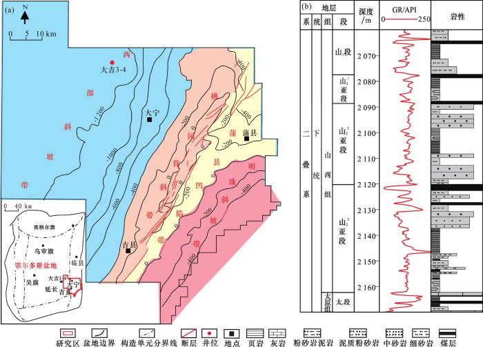 ... [21](a)及山西组山2段地层综合柱状图(b)Structural map of Daning-Jixian blocks in Ordos Basin[21](a) and stratigraphic column(b) of 2nd member of Shanxi FormationFig.12 实验样品与方法