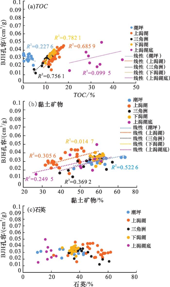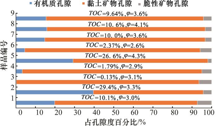 The shales in the 2nd member of Shanxi Formation in the Daning-Jixian blocks, east margin of the Ordos Basin were deposited in a marine-continental transitional environment during the Permian. The Shan23 sub-member is characterized by large thickness, few and thin interlayers, which is the key target for transitional shale gas exploration and development. However, there are relatively few related studies on the reservoir characteristics, especially the main controlling factors for the development of the high quality reservoirs need to be further clarified. In this paper, the reservoir characteristics of Shan23 sub-member in Daning-Jixian blocks are systematically studied and the main controlling factors of high quality reservoir development are discussed by using geochemical analysis, compositional analysis and microscopic characterization method. The results indicate that the lower section of the upper lagoon facies in the Shan23 sub-member has the characteristics of high TOC content, high brittle mineral content, high values of BET and BJH, which is the sweet spot for shale gas exploration and development. Pores developed in clay minerals and in organic matter contribute most to the porosity of the Shan23 sub-member, accounting for 76.9% and 18.7% of the total porosity respectively. SEM observation (resolution>6 nm) discloses that different components in shale have great difference in pore size distribution, and the pores developed in organic matter and calcite are mainly in meso-scale. The pore size distribution characteristics of clay minerals are similar with quartz pores where pores developed both in meso and macro scale. The pores developed in feldspar and pyrite distribute in a wide range and the distribution is relatively uniform. Single factor analysis shows that the content of the clay minerals is the dominant controlling factor for pore development in the Shan23 sub-member. The organic matter content has a certain effect on the pore development of shale, but the influence of the organic matter type on the pore development is not obvious.