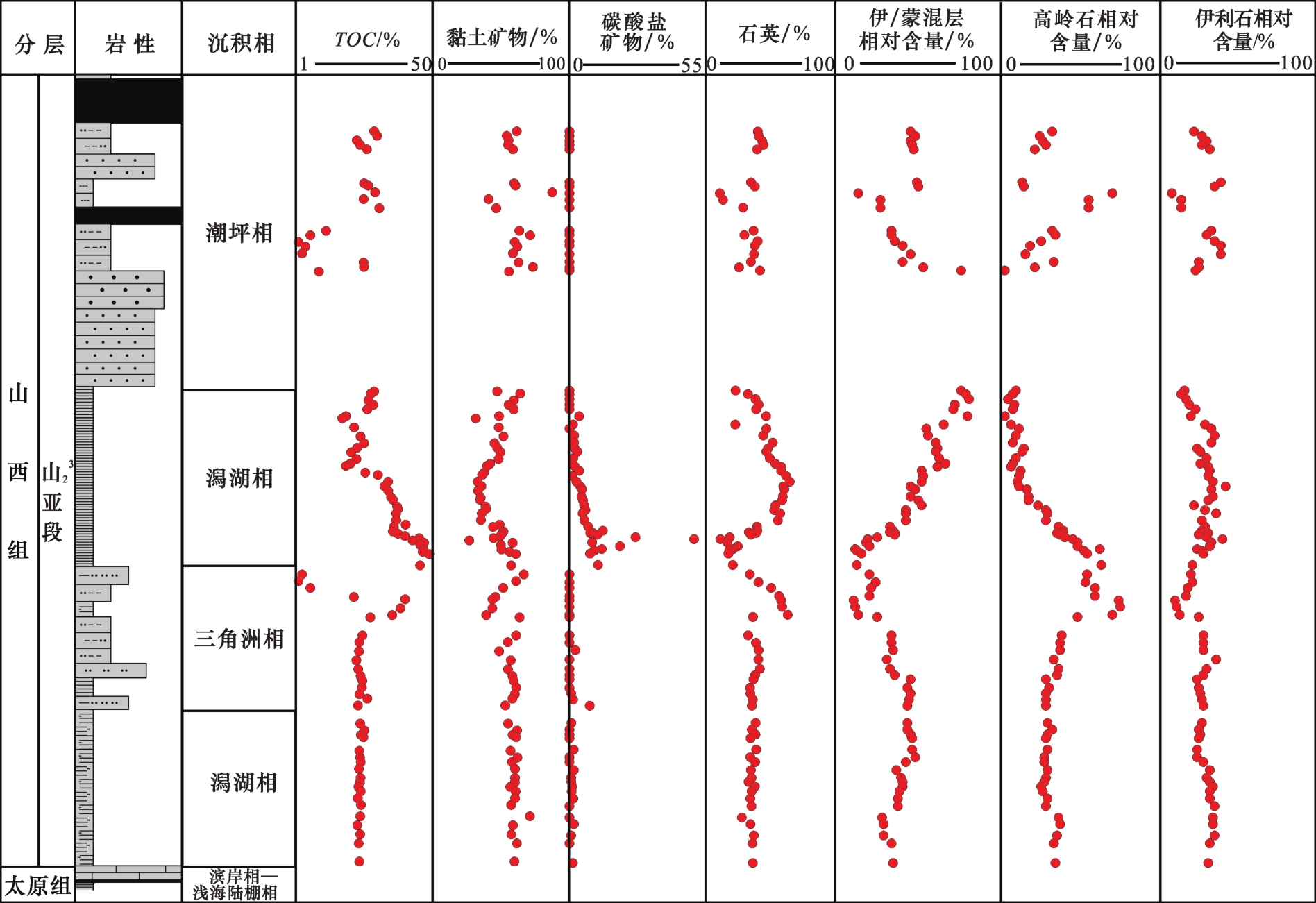 图2 大吉3-4井山23亚段TOC与主要矿物成分综合柱状图(数据引自参考文献[ |