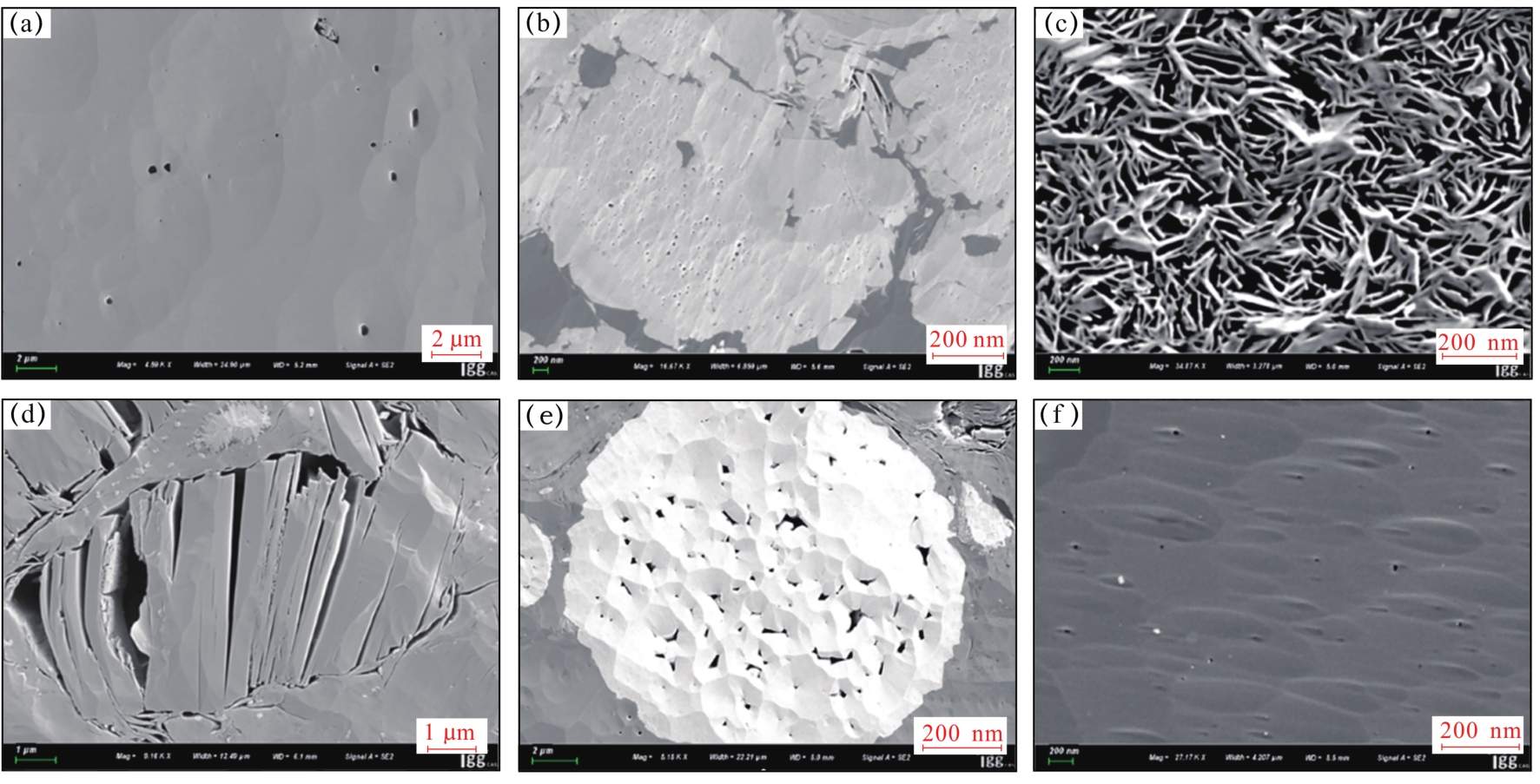 图7 典型矿物孔隙发育特征 (a)石英孔隙,样品205,孔隙大小均有分布,孔隙边缘呈棱角状;(b)方解石孔隙,样品183,溶蚀孔隙密集发育,尺寸较为均一;(c)黏土晶间孔,样品229,孔隙非常发育,以条形孔为主;(d)长石孔隙,样品199,孔隙为解理缝,长条形为主;(e)黄铁矿晶间孔,样品225,孔隙形态不规则,三角形为主;(f)有机质孔,样品179,孔隙形态较为均一,孔隙尺寸小 |
