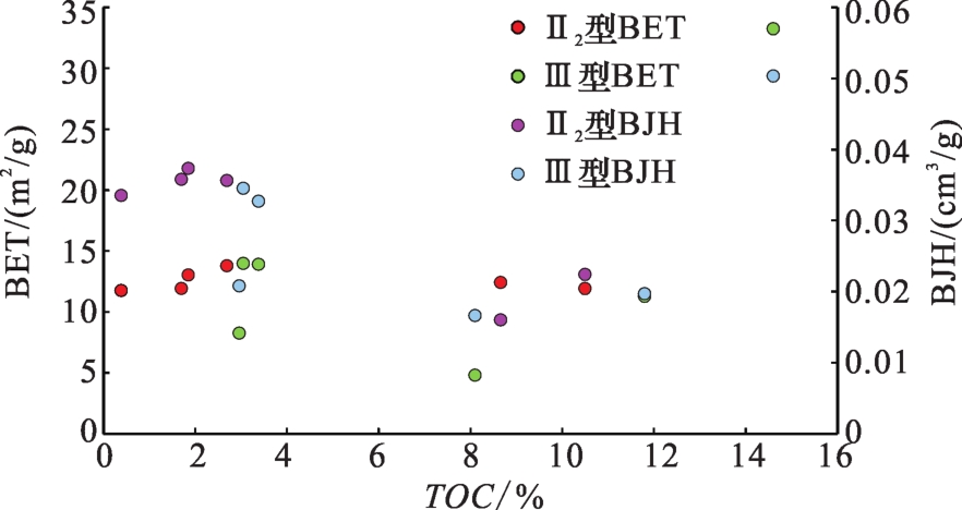 图11 黏土含量相近但干酪根类型不同页岩样品的BET与BJH分布特征 |