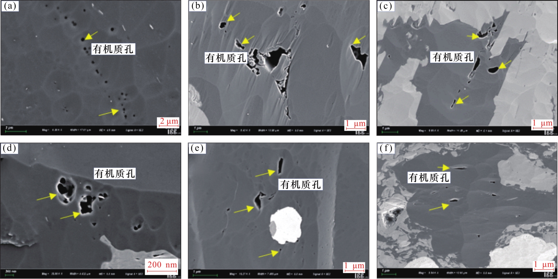 图12 山23亚段不同干酪根类型孔隙发育特征 (a)TOC=3.53%,Ⅲ型, 有机质孔呈线装分布,以圆形孔为主; (b)TOC=4.04%,Ⅲ型, 有机质孔形态不规则,孔隙尺寸较大;(c)TOC=14.6%,Ⅲ型,孔隙形态椭圆形为主,具有定向排列特征; (d)TOC=3.38%,Ⅱ2型,多个孔隙相互连接成较大孔隙,孔隙以圆形孔为主;(e)TOC=4.19%,Ⅱ2型,孔隙形态不规则;(f)TOC=14.4%,Ⅱ2型,孔隙形态不规则,有圆形,椭圆形和三角形,定向性不明显 |